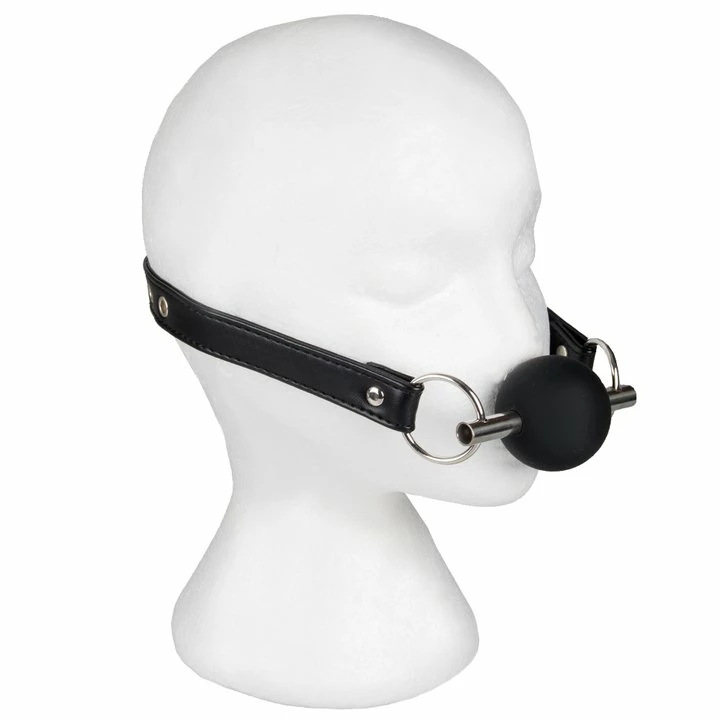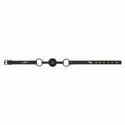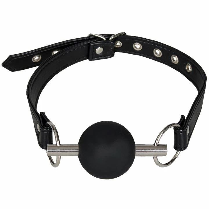 β’ The moveable silicone ball gag is attached via a metal bar and rings