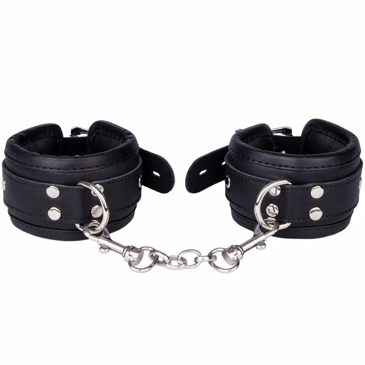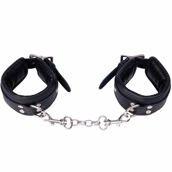 Soft in real black leather, each adjustable 14.5-inch strap is padded for a comfy, snug fit up to a 13-inch circumference. Reinforced stitching and premium silver-tone hardware deliver superior build quality, while the D-rings and detachable 5.5-inch chain allow imaginative, versatile bondage.
