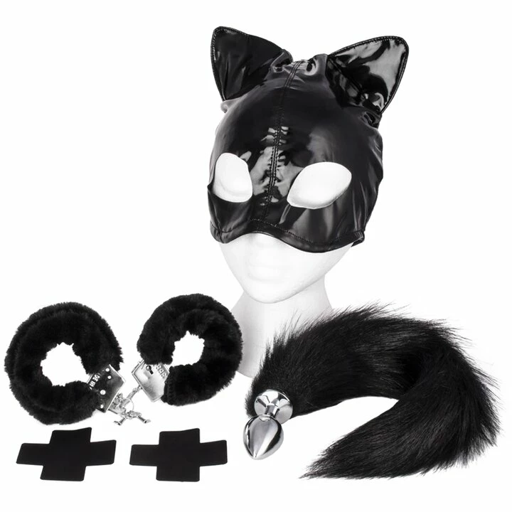 โข Includes a Wet Look Cat Mask, Black Tail Butt Plug, Black Cross Nipple Pasties, and Black Faux Fur Metal Handcuffs