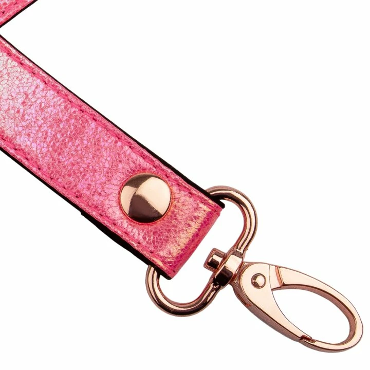 β’ Iridescent pink vegan leather with stylish rose gold trigger clasps
