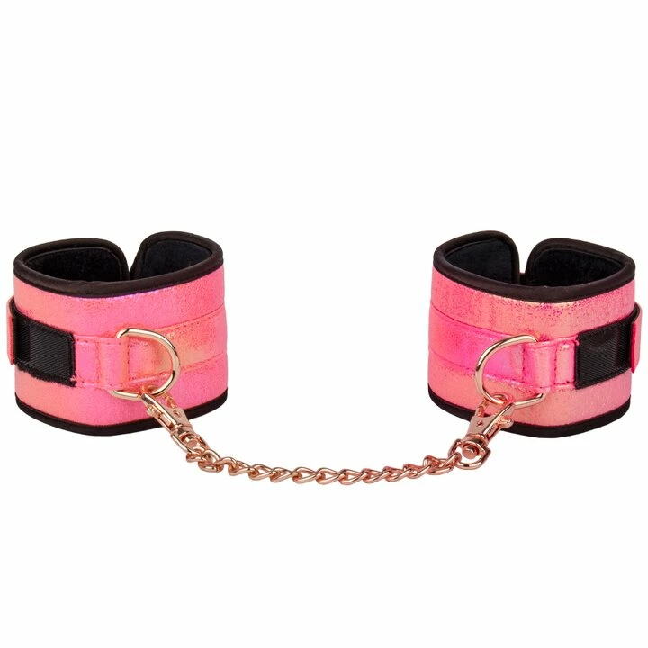 Shimmering in an iridescent pink finish, each quilted cuff is connected via a stylish 8-inch rose gold trigger clasp chain, adjusting from 11.5 to 15-inches for quick, comfortable placement. Velcro fastenings are ideal for beginner’s bondage as new players can be safe in the knowledge that these restraints can be quickly removed as necessary.