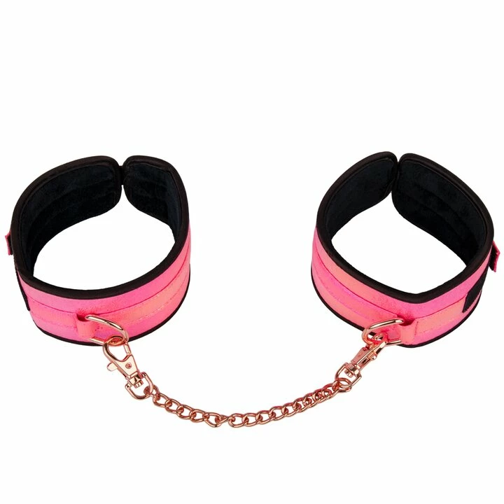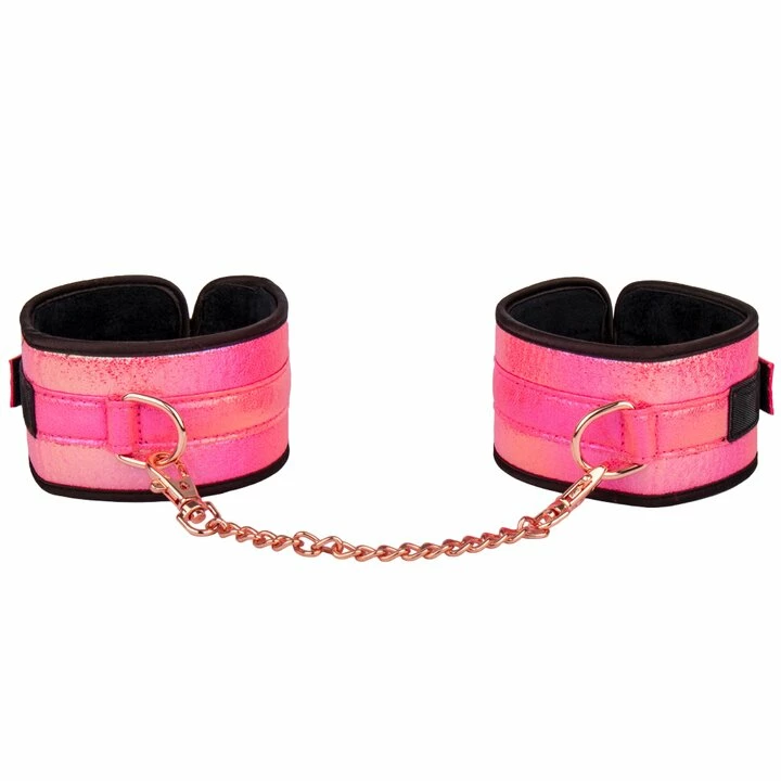Shimmering in an iridescent pink finish, each quilted cuff is connected via a stylish 7-inch rose gold trigger clasp chain, adjusting from 9.5 to 13-inches for quick, comfortable placement. Velcro fastenings are ideal for beginner’s bondage as new players can be safe in the knowledge that these restraints can be quickly removed as necessary.
