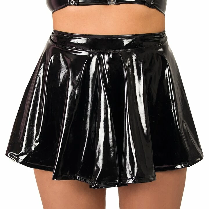 For fetish-inspired style for the bedroom and beyond, accentuate your shape in the Wet Look Zip-Up Mini Skater Skirt by Bondara Siren.
