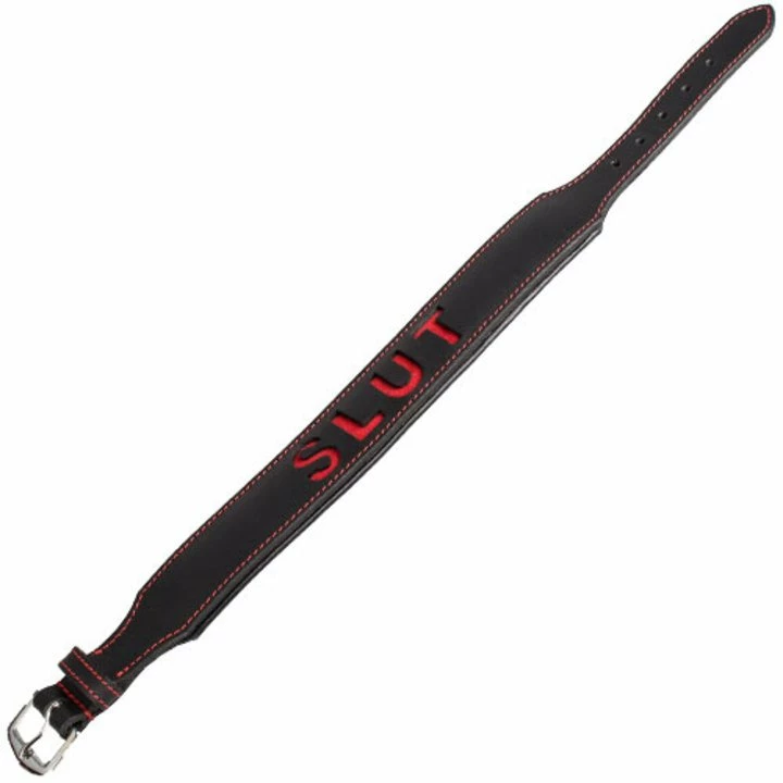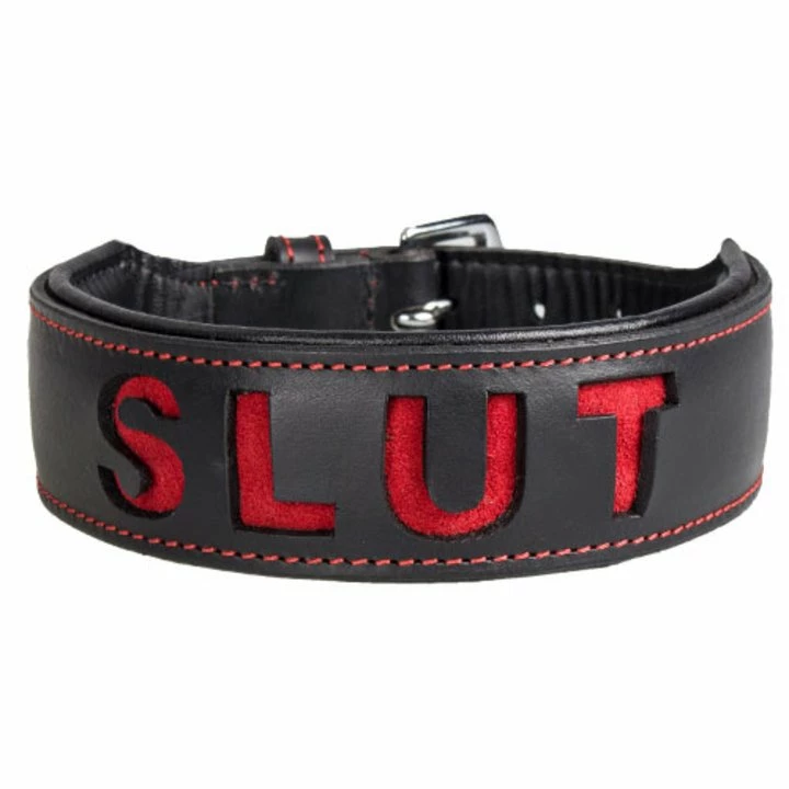 Let everyone know who you are with the Slut Real Leather Collar from Bondara. Contrasting against the black leather, cut-out, red letters emblazon the centre of the collar with โSLUTโ. Perfect for reminding submissives that theyโre your own personal slut or as a finishing accessory to a fetish outfit, this collar will be a popular addition to your bondage box.