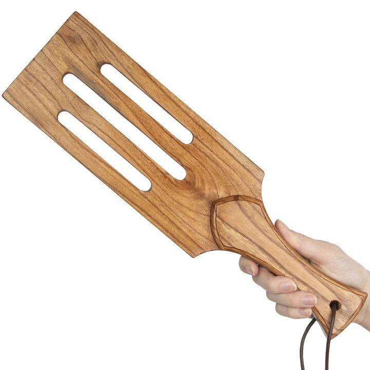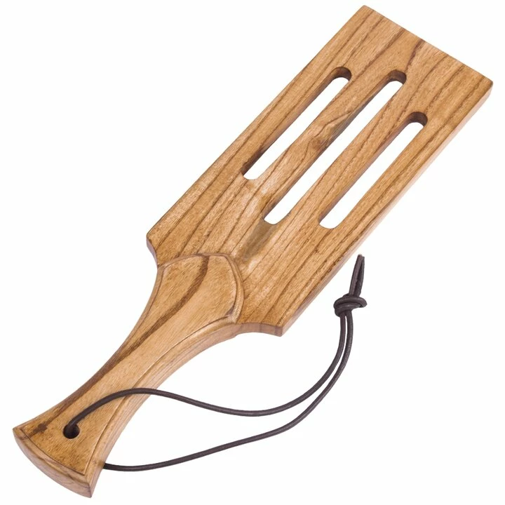This punishing paddle is gratifying to grip with a bevelled 5-inch handle and a real leather loophole that wraps securely around your wrist. Easy to clean; wipe with a damp cloth after use, then hang in your kinky closet until next time.
