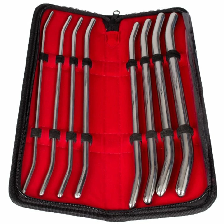 Train yourself up with the Torment Stainless Steel Set of Eight Pratt Urethral Sounds and be taken from a urethral beginner to an expert in sounding sessions. With each one measuring approximately 11 inches, the diameter of each sound gently increases. Starting at 0.5cm and finishing at 1.4cm wide, find your perfect fit as you experiment and explore each one.ย